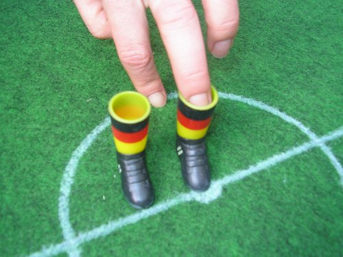...und stellt seine neuen Füße auf ein Fußballfeld, welches ca. 60 cm mal 100 cm groß ist. Man spielt Mann gegen Mann.